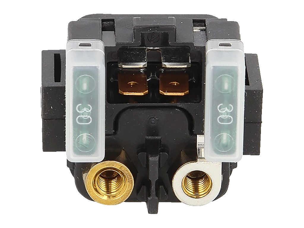 При срабатывании реле подает напряжение с аккумулятора на пусковой двигатель электростартера и происходит запуск двигателя. Так же на этом реле находятся предохранители, предотвращающие повреждения электростартера при неисправностях электроцепи мотоцикла, таких как короткое замыкание.