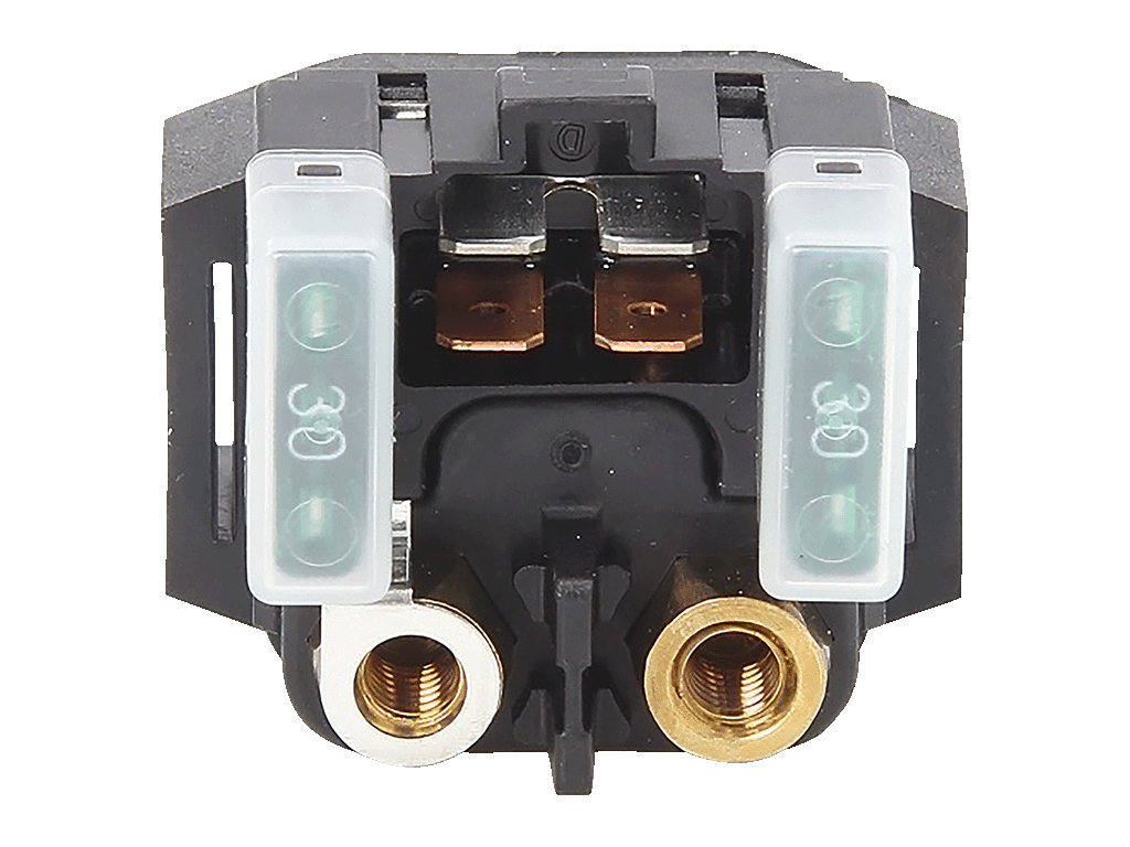 При срабатывании реле подает напряжение с аккумулятора на пусковой двигатель электростартера и происходит запуск двигателя. Так же на этом реле находятся предохранители, предотвращающие повреждения электростартера при неисправностях электроцепи мотоцикла, таких как короткое замыкание.